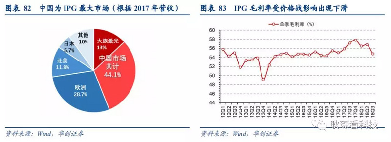 中國(guó)作為IPG最大市場(chǎng),多方因素影響IPG業(yè)績(jī)。2018Q3 IPG在中國(guó)市場(chǎng)營(yíng)收下降9%,主要受到匯率波動(dòng)、貿(mào)易戰(zhàn)、國(guó)產(chǎn)化替代和價(jià)格戰(zhàn)、下游最大客戶(hù)大族激光需求下降等因素影響。其中價(jià)格戰(zhàn)對(duì)IPG的營(yíng)收和毛利率均產(chǎn)生了不利影響。