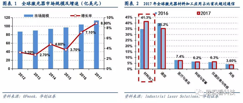 激光行業(yè)市場(chǎng)規(guī)模整體維持增長(zhǎng)態(tài)勢(shì),激光加工設(shè)備占比擴(kuò)大。據(jù)OFweek數(shù)據(jù),全球激光器市場(chǎng)規(guī)模從2012年87.3億美元到2017年113.3億美元,年復(fù)合增長(zhǎng)5.35%,2017年同比增速達(dá)8.9%,預(yù)計(jì)未來(lái)仍將保持10%左右增長(zhǎng)。其中2017年全球工業(yè)激光器市場(chǎng)規(guī)模約為50億美元。在品類(lèi)繁多的激光設(shè)備市場(chǎng)中,我們重點(diǎn)關(guān)注與激光加工設(shè)備相關(guān)的市場(chǎng)。2017年全球激光加工設(shè)備市場(chǎng)規(guī)模約為170億美元,國(guó)內(nèi)市場(chǎng)規(guī)模約為全球的33%左右,即56億美元左右。在應(yīng)用領(lǐng)域中,材料加工與通信占比最大,分別高達(dá)41.3%和35.2%,且近年來(lái)材料加工占比不斷擴(kuò)大。