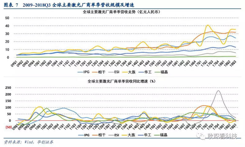 激光產(chǎn)業(yè):回顧09年至今全球激光產(chǎn)業(yè)龍頭近10年季度數(shù)據(jù),產(chǎn)業(yè)規(guī)模整體呈周期性波動(dòng)向上趨勢(shì),以IPG、相干、大族、華工為代表的海內(nèi)外龍頭公司季度營(yíng)收穩(wěn)步上行;另一方面,季度同比數(shù)據(jù)顯示全球激光產(chǎn)業(yè)規(guī)模歷經(jīng)09H2~10H1、17H1~18H1兩次較大幅度提升后(切割市場(chǎng)滲透、宏觀加工及消費(fèi)電子創(chuàng)新需求向好),目前受工業(yè)制造宏觀周期、終端產(chǎn)品創(chuàng)新周期、中美 貿(mào)易戰(zhàn)等多因素疊加影響,當(dāng)前產(chǎn)業(yè)處于相對(duì)低迷階段。但我們應(yīng)注意到,國(guó)內(nèi)龍頭設(shè)備廠商依托客戶(hù)拓展及產(chǎn)品升級(jí),不斷進(jìn)駐新應(yīng)用領(lǐng)域(LED、PCB、EV、OLED、半導(dǎo)體)等,在全球激光產(chǎn)業(yè)大周期背景下,有望重復(fù)自身成長(zhǎng)小周期;以銳科為代表的國(guó)產(chǎn)激光器廠商于18年開(kāi)始逐步突破3300W及6000W等中高功率市場(chǎng),雖遭遇海外龍頭價(jià)格競(jìng)爭(zhēng)策略,但規(guī)模化量產(chǎn)與原材料自制比例提升,有望同步降低成本價(jià)格,提升下游滲透速度。國(guó)內(nèi)從激光晶體、激光器到激光及配套自動(dòng)化設(shè)備短期產(chǎn)業(yè)波動(dòng),中長(zhǎng)期向上發(fā)展趨勢(shì)不變。
