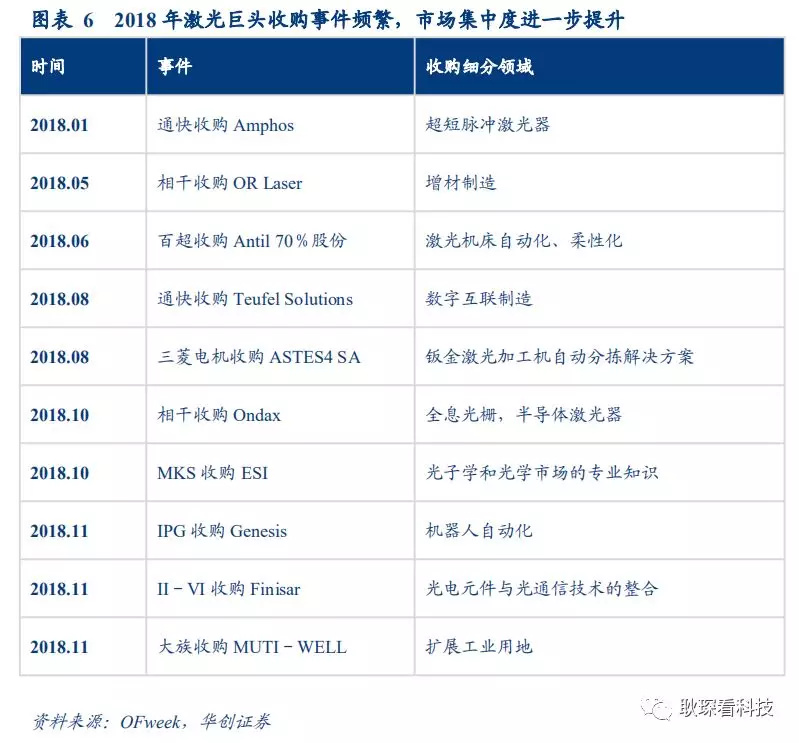 激光行業(yè)高技術(shù)壁壘的特點(diǎn)加速技術(shù)、人才和資本等優(yōu)勢(shì)向頭部集中。激光行業(yè)馬太效應(yīng)明顯,龍頭的優(yōu)勢(shì)一旦形成,與其他廠商差距往往會(huì)拉開(kāi)。從國(guó)外激光廠商的發(fā)展史可以看出,龍頭往往先是以雄厚的技術(shù)積累和產(chǎn)業(yè)鏈整合能力為基礎(chǔ),而后通過(guò)系列收購(gòu)不斷完善技術(shù)和產(chǎn)品布局,最終在細(xì)分領(lǐng)域可能形成寡頭壟斷局面。據(jù)OFweek與Strategies Unlimited提供的市場(chǎng)規(guī)模與份額數(shù)據(jù)推算,當(dāng)前全球工業(yè)激光市場(chǎng)(含激光器、激光設(shè)備等)規(guī)模約在200億美元以上。根據(jù)各廠商2018年業(yè)績(jī)指引與估計(jì),從行業(yè)整體的集中度來(lái)看,激光市場(chǎng)前5大廠商約占51%的市場(chǎng)份額。
