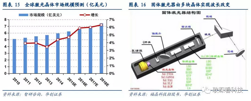 晶體需求彈性大,微加工領(lǐng)域的固體激光器需求增加有望帶動(dòng)其增長(zhǎng)。晶體主要應(yīng)用于固體和光纖激光器,占激光器總價(jià)值約5%,其中占固體激光器總價(jià)值約10%。固體紫外激光器需要多塊晶體倍頻以達(dá)到理想的波長(zhǎng)輸出。此外由于各類(lèi)晶體的使用壽命一般短于激光器使用壽命(受環(huán)境影響較大),以福晶為例,主要產(chǎn)品LBO、BBO、KTP、Nd:YVO4等品質(zhì)保證期均為“一年內(nèi)正常使用”,因此需定期更換晶體,賦予了晶體需求更大的彈性。