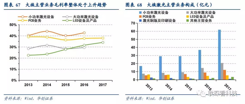 小功率激光設(shè)備已占國(guó)內(nèi)近一半市場(chǎng)份額,激光打標(biāo)設(shè)備全球市場(chǎng)份額領(lǐng)先。雖然小功率市場(chǎng)已經(jīng)成為紅海,但大族的優(yōu)勢(shì)仍然在高端、前端、先進(jìn)的設(shè)備上得以體現(xiàn)。大族小功率板塊主要為光纖和紫外激光設(shè)備。2017年受益于A客戶(hù)創(chuàng)新改款,訂單增長(zhǎng)顯著。小功率激光打標(biāo)、精密焊接、精密切割等業(yè)務(wù)實(shí)現(xiàn)營(yíng)收61.88億元,在大族營(yíng)收中占比50%以上,同比增幅高達(dá)68%,表現(xiàn)依舊強(qiáng)勁,是公司業(yè)績(jī)?cè)鲩L(zhǎng)的主要?jiǎng)恿ΑP」β拾鍓K毛利率較為穩(wěn)定,但業(yè)務(wù)體量增長(zhǎng)值得期待,主要得益于差異化產(chǎn)品的切入,積極爭(zhēng)取三星與HOV訂單,同時(shí)配合面板廠推進(jìn)OLED設(shè)備國(guó)產(chǎn)化。