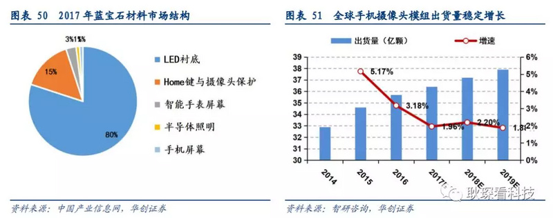 2. 藍(lán)寶石市場(chǎng)空間可觀:藍(lán)寶石晶體集優(yōu)良的光學(xué)、化學(xué)、物理性能于一身,具有強(qiáng)度高、硬度大、耐沖刷等特性,而藍(lán)寶石的切割加工離不開(kāi)激光工藝。主要應(yīng)用有:LED襯底、智能機(jī)攝像頭保護(hù)、Home 鍵、藍(lán)寶石表鏡等。據(jù)智研咨詢(xún)數(shù)據(jù),LED襯底對(duì)藍(lán)寶石需求量占比最大,達(dá)80%以上;其次為Home鍵與攝像頭,占比約為15%。而在LED產(chǎn)品的應(yīng)用中,手機(jī)及其他電子設(shè)備占比高達(dá)59%。在智能機(jī)攝像頭應(yīng)用上,雙攝已成主流,華為開(kāi)啟三攝時(shí)代,未來(lái)四攝時(shí)代也已不遠(yuǎn),藍(lán)寶石的鏡頭防護(hù)應(yīng)用的需求料將持續(xù)增長(zhǎng)。據(jù)YOLE數(shù)據(jù),預(yù)計(jì)到2019年,藍(lán)寶石市場(chǎng)規(guī)模將達(dá)到81.85億美元,近8年年均復(fù)合增長(zhǎng)率達(dá)57%,前景十分可觀。