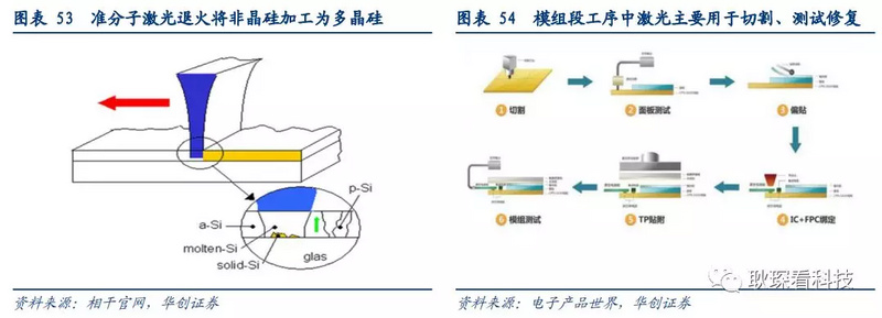 激光加工在OLED面板生產(chǎn)中至關(guān)重要。OLED面板的制造主要分為背板段、前板段和模組段三道工序,激光工藝貫穿始終:在背板段主要是準(zhǔn)分子激光退火;前板段主要是LLO激光剝離及柔性切割;模組段主要是切割、測(cè)試修復(fù)及窄邊框加工等。