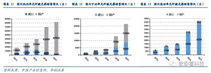 國(guó)內(nèi)龍頭實(shí)力漸強(qiáng),國(guó)產(chǎn)化替代為其發(fā)展提供成長(zhǎng)空間。近幾年國(guó)內(nèi)廠商的技術(shù)進(jìn)步顯著。以光纖激光器龍頭銳科激光為例,其6kW以下產(chǎn)品性能已接近國(guó)際領(lǐng)先水平,并具備更高性?xún)r(jià)比。再以國(guó)內(nèi)光纖激光器市場(chǎng)為例,據(jù)中國(guó)產(chǎn)業(yè)信息網(wǎng)數(shù)據(jù)(按銷(xiāo)售臺(tái)數(shù)計(jì)), 2017年國(guó)內(nèi)光纖激光器低功率市場(chǎng)已基本實(shí)現(xiàn)國(guó)產(chǎn)化(97%),中功率市場(chǎng)國(guó)內(nèi)企業(yè)略占優(yōu)勢(shì)(60%),而高功率市場(chǎng)國(guó)產(chǎn)化率十分有限(11%),也將成為未來(lái)國(guó)內(nèi)光纖激光器企業(yè)重點(diǎn)攻克的方向。