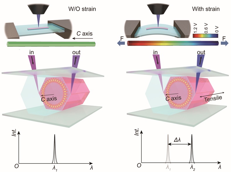 近日,中國(guó)科學(xué)院北京納米能源與系統(tǒng)研究所王中林、潘曹峰及盧俊峰在先前報(bào)道的動(dòng)態(tài)調(diào)控ZnO回音壁激光模式的基礎(chǔ)上,利用壓電極化效應(yīng)和壓阻效應(yīng)協(xié)同作用,對(duì)激光模式進(jìn)行選擇性輸出,并實(shí)現(xiàn)單模激光輸出與動(dòng)態(tài)調(diào)控,也為進(jìn)一步推進(jìn)以顏色分辨為信號(hào)源的應(yīng)力傳感器構(gòu)建件打下堅(jiān)實(shí)的基礎(chǔ)。相關(guān)成果以Dynamic Regulating of Single-Mode-Lasing in ZnO Microcavity by Piezoelectric Effect 為題發(fā)表在近期的Materials Today上。