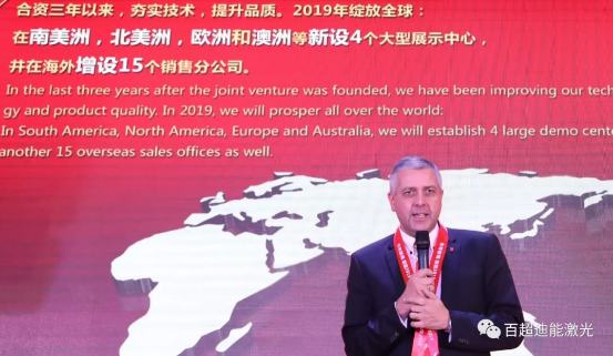 慶典致辭,集團(tuán)總裁Alex Waser激情地對(duì)百超迪能不但取得過往年年高增長,而且2018年逆勢迸發(fā)、再創(chuàng)新高予以高度贊美和熱烈祝賀!并對(duì)2019年百超迪能激光再次綻放全球、續(xù)創(chuàng)佳績予以了明確的全球戰(zhàn)略部署。