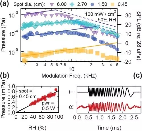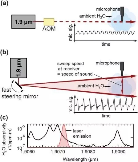 其原理基于“光聲效應”:材料吸光后,會形成聲波。本例中,研究人員利用了空氣中的水蒸氣來吸收光線、并產生聲音。