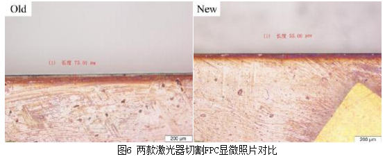 圖6為兩款激光器切割0.16mm厚FPC外觀效果對比圖。憑借FORMULA 15W@50KHz激光器短脈寬與高頻率下的高速度,FPC的切割質量更好,熱影響相比舊款減小了約26%,同時有效切割速度從50mm/s提高到70mm/s,提高了約40%。