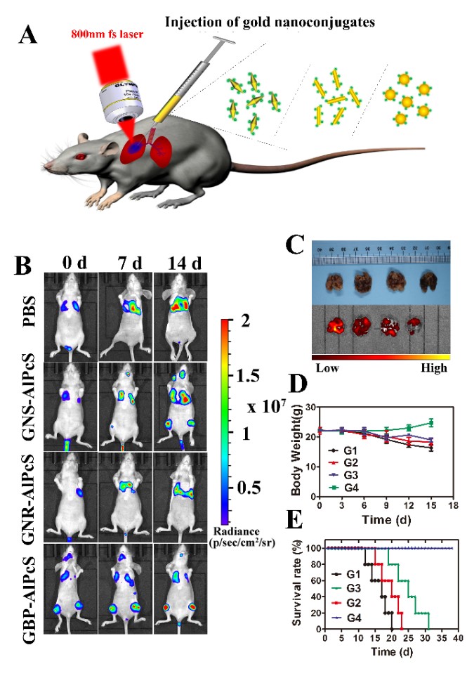 該實(shí)驗(yàn)室研究團(tuán)隊(duì)同香港科技大學(xué)合作,設(shè)計(jì)并使用了新型金納米雙錐負(fù)載光敏劑,利用納米雙錐在生物第一光學(xué)窗口的高效雙光子吸收和能量轉(zhuǎn)移,使光敏劑能夠高效產(chǎn)生單線態(tài)氧殺傷癌變組織細(xì)胞。通過(guò)對(duì)小鼠活體肺部深度原位腫瘤的治療對(duì)比實(shí)驗(yàn),充分證實(shí)了雙光子光動(dòng)力治療的效果,經(jīng)光照治療后小鼠肺部腫瘤的生長(zhǎng)即被明顯抑制,小鼠的生存期延長(zhǎng)了一倍以上。該研究成果將促進(jìn)雙光子光動(dòng)力治療技術(shù)在臨床上的應(yīng)用。