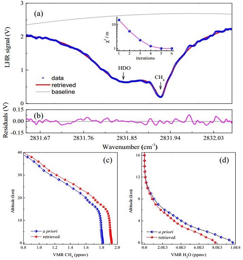 紅外激光外差光譜技術具有光譜分辨率和垂直空間分辨率高、采樣速度快、體積小、功耗低、散粒噪聲極限探測靈敏度等優點,在大氣衛星遙感探測、天文觀測等領域具有重要的應用前景。課題組談圖副研究員、王貴師副研究員等人以3.53 μm帶間級聯激光器作為本振光源,建立了0.003cm-1光譜分辨率的大氣甲烷及水汽地基被動激光外差探測系統,獲得了高光譜分辨率的光譜數據,并基于OEM(最優估計算法)及RFM(參考正向模型)建立了大氣溫室氣體廓線反演模型,利用測量數據獲得了大氣甲烷和水汽的垂直廓線,以及甲烷氣體柱總量及干空氣混合比。