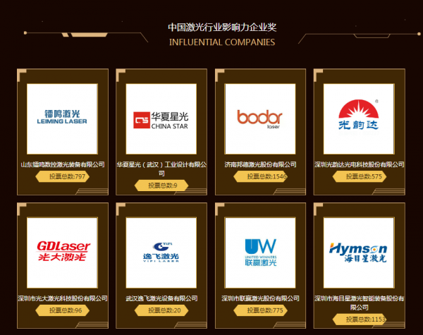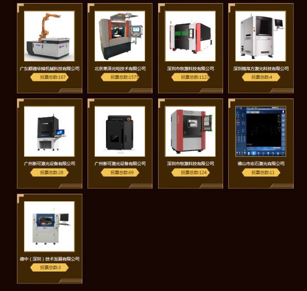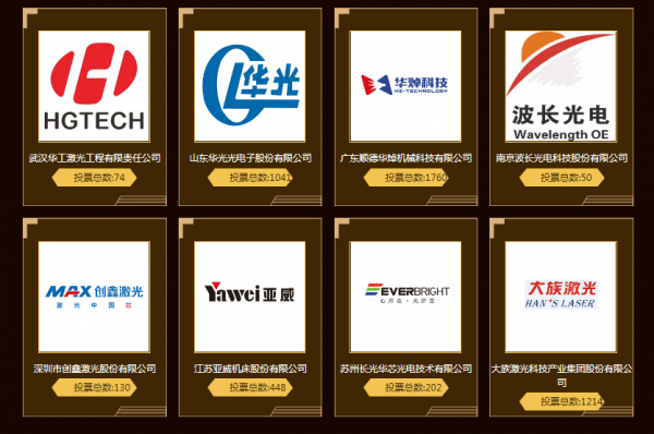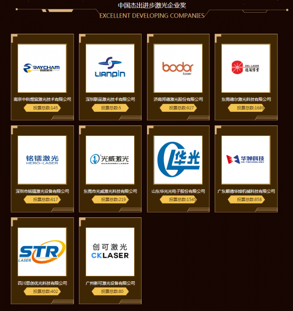 今年共10家企業入選進步獎的投票評選。根據目前投票結果顯示:東莞德爾激光科技有限公司(1689票)和山東華光光電子股份有限公司(1545票)投票數均已破千并不相上下。濟南邦德激光股份有限公司緊跟其后,目前投票數達927票。