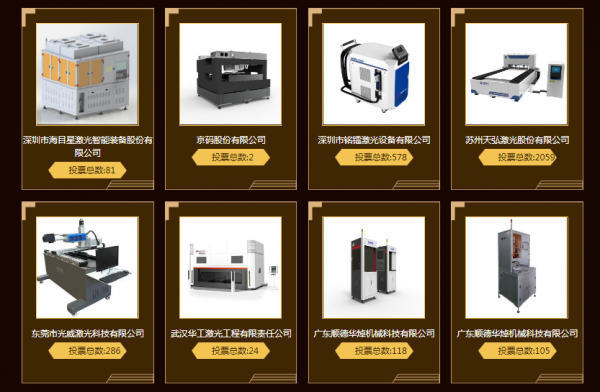 共16家企業入選投票評選,根據目前投票結果顯示,廣東順德華焯機械科技有限公司、濟南邦德激光股份有限公司、大族激光科技產業集團股份有限公司分列冠亞季軍,投票數分別為:1760票、1546票、1214票。目前投票數破千的企業還有深圳市海目星激光智能裝備股份有限公司和山東華光光電子股份有限公司。
