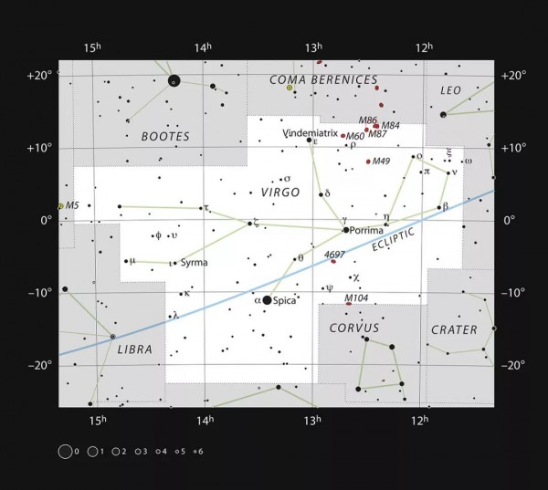 這張圖顯示了巨型星系M87在室女座(處女座)中的位置。這張地圖顯示,在良好的條件下,大多數星星是肉眼可見的。資料來源:ESO、IAU、Sky & Telescope