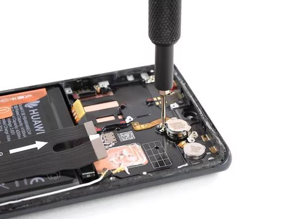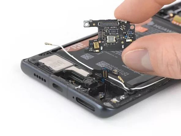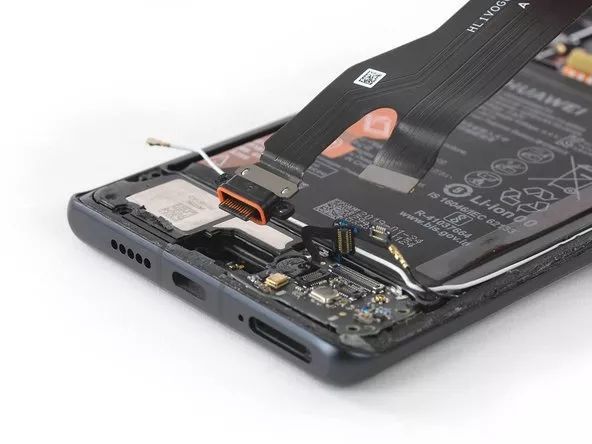 想要拆下華為P30 Pro的屏幕指紋模塊,就先要拆下華為P30 Pro長(zhǎng)長(zhǎng)的排線,這根排線與USB-C接口相連。
