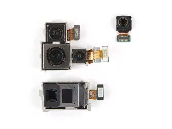 華為P30 Pro內(nèi)共有五顆攝像頭,這也成就了華為P30 Pro非凡的拍照能力,從左上角開始依次是2000萬像素超廣角鏡頭、4000萬像素廣角鏡頭、ToF鏡頭、800萬像素長(zhǎng)焦鏡頭以及右上角的3200萬像素前置攝像頭。所有的攝像頭拆解相對(duì)而言比較方便,只有一根排線與主板相連。