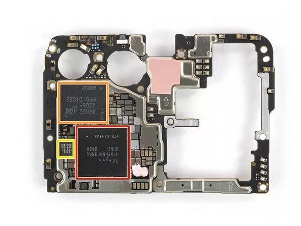 iFixit將華為P30 Pro核心部分的保護(hù)片取下,出現(xiàn)在我們眼前的:紅色部分是SK海力士的H9HKNNNFBMAU LPDDR4X存儲(chǔ)芯片,華為麒麟980處理器則位于這顆存儲(chǔ)芯片底下。橙色部分是美光JZ064 MTFC128GAOANAM-WT 128 GB閃存。黃色部分是海思HI6405音頻芯片。