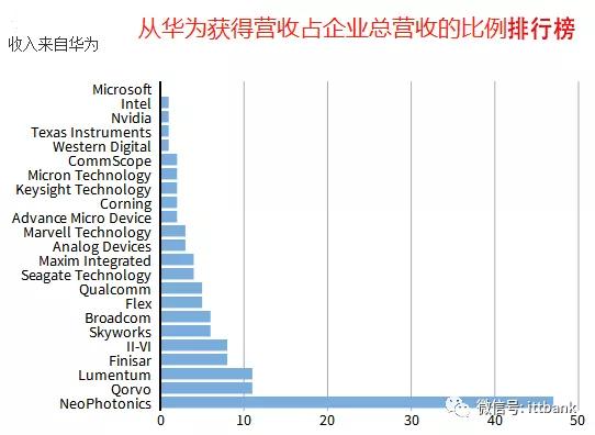 從上圖可知,對華為依賴最高的企業是NeoPhotonics,這家企業有47%的營收是來自華為。早在2008年,時任NeoPhotonics公司董事局主席兼CEO Tim Jenks就表示,他們已經成為了華為最大的光器件供應商。而根據國信證券的數據,從2007年到2017年的整整十年,國內客戶占該公司的營收比一度高達68%。其次是Qorvo、Lumentum、Finisar、II-VI、Skyworks等一系列廠商。