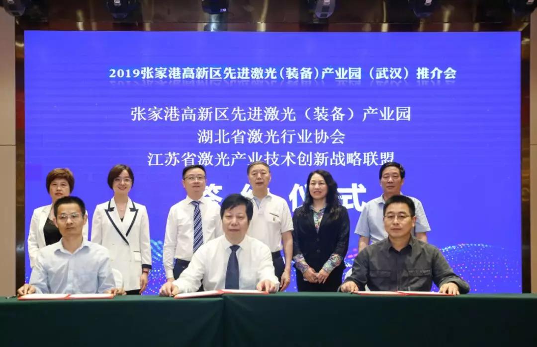 ▲張家港市大新鎮黨委書記徐鳳琪、湖北省激光行業協會副會長王鋒及江蘇省激光產業技術創新戰略聯盟秘書長陳長軍分別代表各自單位簽訂了戰略合作協議。