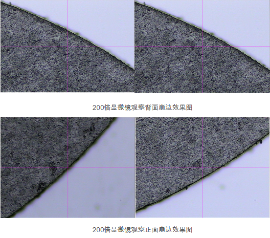 3.藍(lán)寶石正面切割邊緣效果較好,崩邊尺寸的崩變量較背面崩邊尺寸小,背面崩邊量也控制在10μm以下。