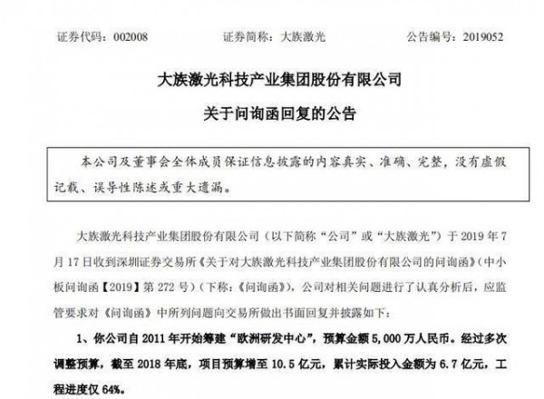 7月21日,大族激光回應了深交所于7月17日發(fā)送的問詢函,回應了外界對其建設多年尚未完工、并多次增加投資預算的歐洲研發(fā)中心項目帶來的系列質(zhì)疑,并解答了歐洲研發(fā)中心與大股東大族控股之間是否存在資金占用,以及應付職工薪酬余額較高問題。