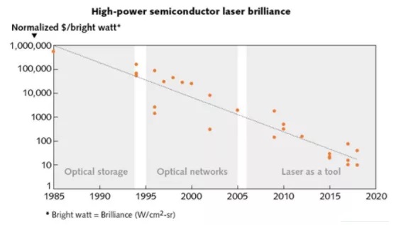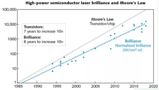 圖1:高功率半導體激光器的亮度和摩爾定律的比較。