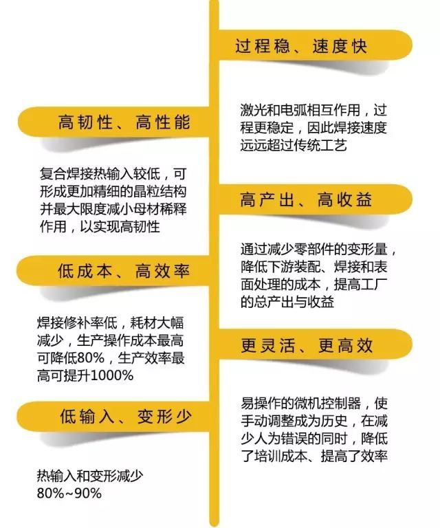 激光復(fù)合焊結(jié)合了激光焊和氣保焊的主要優(yōu)點(diǎn),并極大程度地避免了二者的缺點(diǎn),同時(shí)也衍生出了很多新的專(zhuān)屬特點(diǎn),極高的焊接速度、增強(qiáng)的機(jī)械性能,使之成為具有極大應(yīng)用前景的新型焊接熱源。