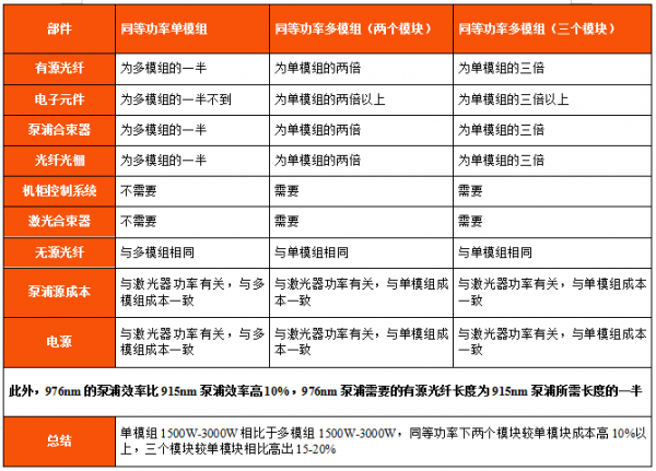 976nm單模塊相比于同功率915多模塊大大減少原材料使用。976nm泵浦技術路線可實現單模單腔3000W,元器件的成本降低較多,相比如多模塊的元器件使用對比如下: