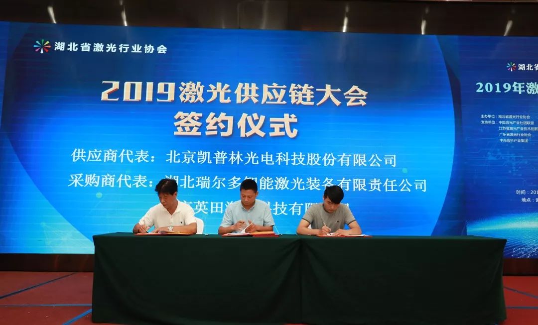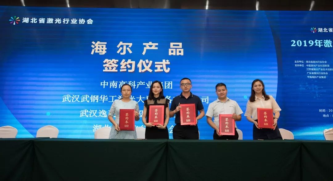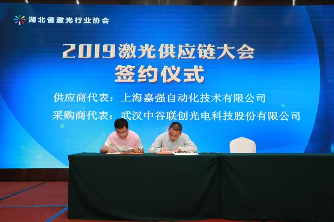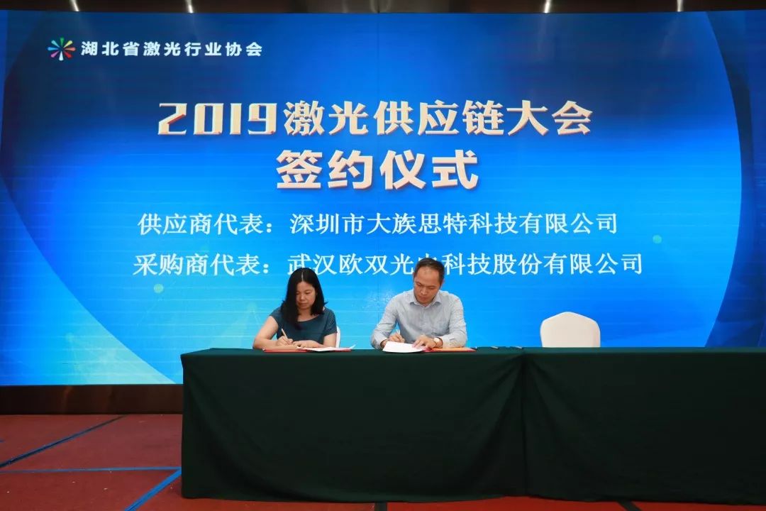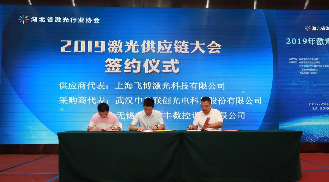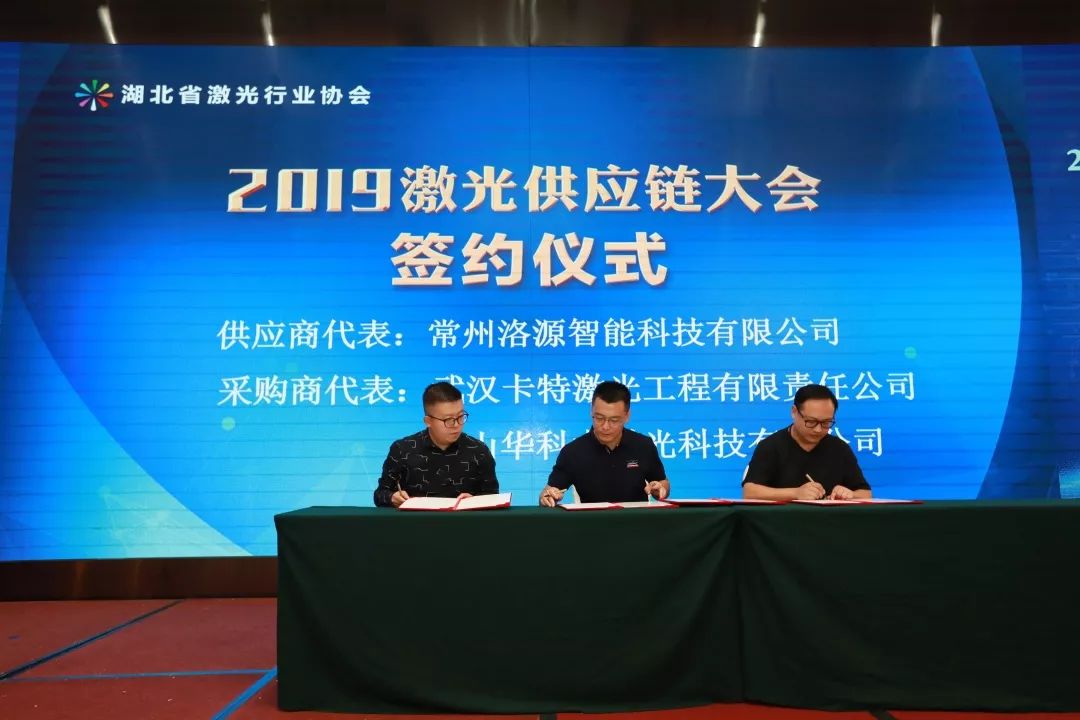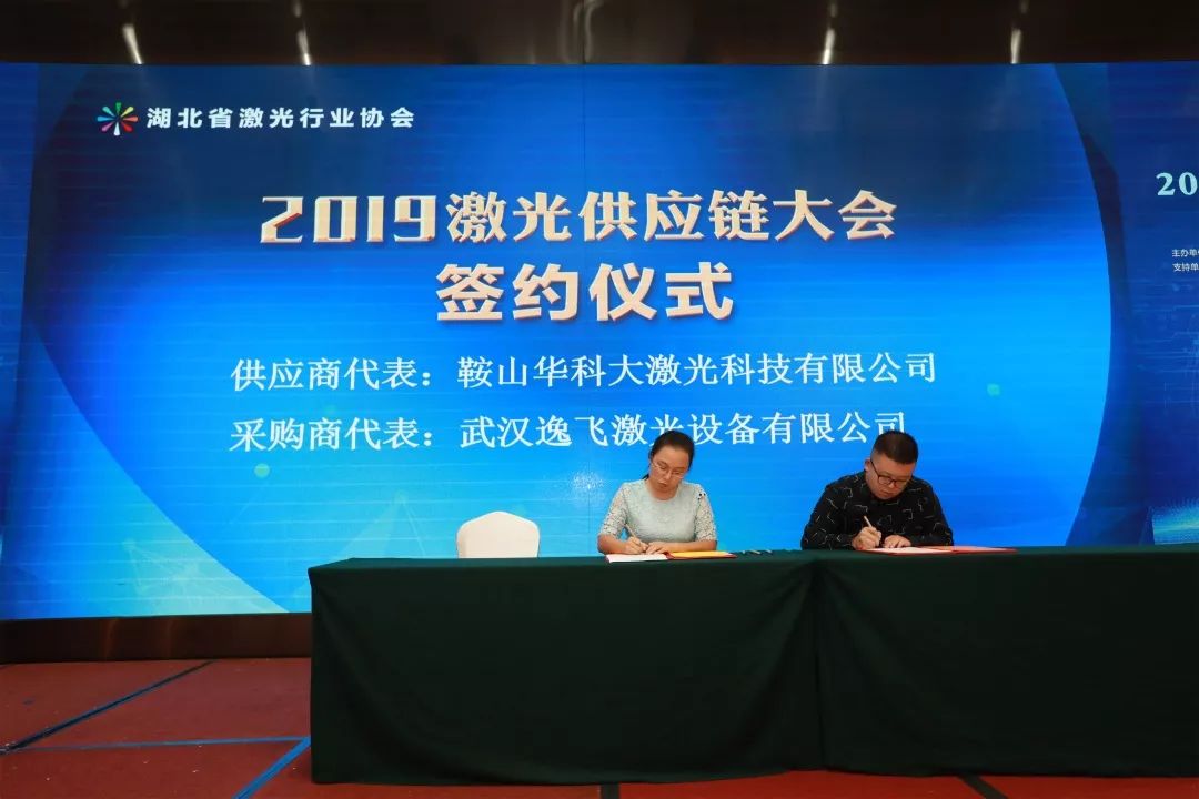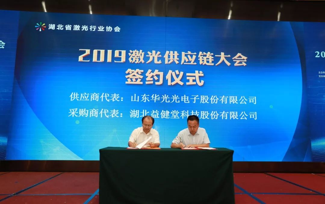 會議第二項,是湖北省激光行業協會秘書長童吉山先生與山東省激光產業創新聯盟秦鵬秘書長的戰略簽約儀式,加強兩省的產業交流與合作。省激光協會名譽會長楚天激光集團董事長孫文、副會長省輕工業科學研究院院長劉力、華俄激光董事長付俊、匯科信股份董事長楊誠、安揚激光CEO陳抗抗博士、長飛光纖光纜數據通信事業部特種產品線總經理童維軍博士上臺一起見證這一重要時刻。
