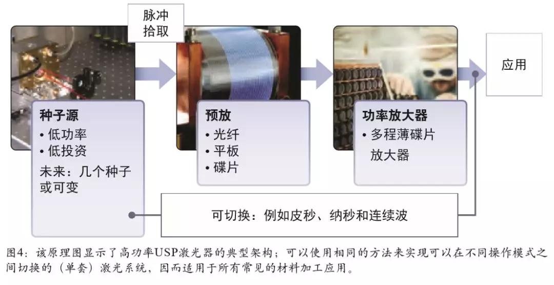 提供高平均功率的超短脈沖激光系統,都基于小的種子振蕩器和一個或多個放大級(圖4)。重要的是,在高平均功率下,這些放大器(例如片狀預放大器和多程碟片功率放大器)對于超短脈沖或CW輻射同樣有效。因此,通過集成額外或更靈活的種子源,沒有技術上的原因會阻礙我們建立一個可以在CW和脈沖或 USP 操作之間切換的單套激光系統。