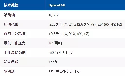這一任務(wù)通過一個SpaceFAB定位機(jī)器人完成,其可在所有直線和角度方向上實(shí)現(xiàn)六自由度運(yùn)動。SpaceFAB專門針對高真空使用而定制,極其緊湊,配備真空兼容型步進(jìn)電機(jī),可適用于-50至+80攝氏度的溫度范圍。