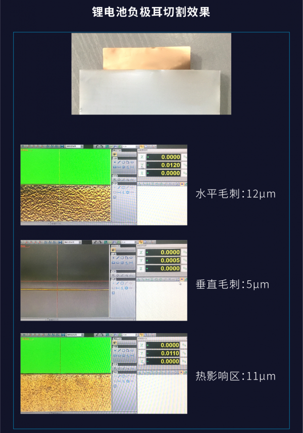 從切割效果可見:激光切割極耳的垂直毛刺小于10um,水平毛刺小于15um,熱影響區小于15um。這些工藝瑕疵得到嚴格的控制,極大降低了鋰電池的安全隱患。