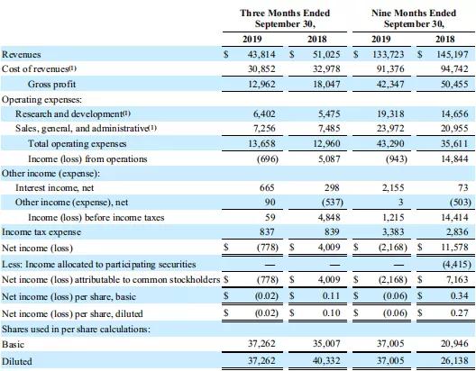 當(dāng)?shù)貢r間11月4日,高功率半導(dǎo)體和光纖激光器的領(lǐng)先供應(yīng)商恩耐公司公布了2019年第三季度的財務(wù)業(yè)績。報告顯示,恩耐2019年第三季度的收入為4381.4萬美元,同比下降14.1%;凈虧損80萬美元,去年同期凈利潤為400.9萬美元;第三季度毛利率為29.6%,同比下降6個百分點(2018年第三季度為35.4%)。而2019年前三季度總營收為1.34億美元,同比下降7.9%;凈虧損為216.8萬美元,去年同期凈利潤為1157.8萬美元;毛利率為31.7%,同比下降3個百分點(2018年前三季度為34.8%)。