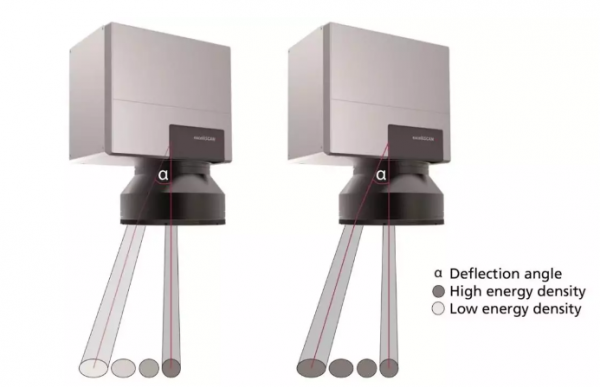 即使使用遠心鏡頭,作用在工件上的激光光斑大小還是會隨著掃描頭內鏡片的偏轉角度而變化. XL SCAN的軌跡規劃可以根據偏轉角度調整激光參數。這種情況下即便光斑大小在沿著激光路徑有很小的變化,其能量密度也能保持不變.因此,激光在薄膜和其他材料上的均勻加工得以實現.