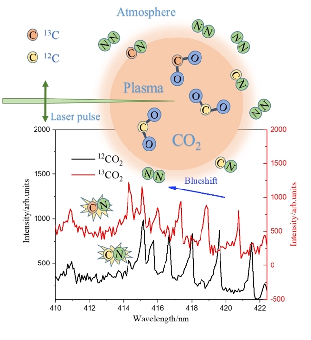 碳循環廣泛存在于自然界中,含碳化合物在地球各大圈層中的循環過程,直接影響著人類發展和生態環境的穩定。近年來,大氣中二氧化碳等溫室氣體的急劇增長更是引起了社會各界的廣泛關注。穩定同位素技術是分析含碳化合物溯源和碳循環過程的有效手段,因而對碳同位素的探測研究也是研究熱點之一。該課題組通過自主設計,研制出一套基于激光誘導擊穿光譜(LIBS)技術的氣溶膠快速在線探測系統,并成功將其應用在大氣環境下顆粒物的實時原位在線探測中。基于該套探測系統,不但能夠實現對氣溶膠成分的快速分析,同時也可以借助同位素分子光譜分析在線探測大氣碳同位素,這為大氣碳循環的研究提供了理論依據與技術支撐。