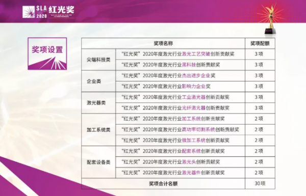 五十多年來,激光技術已在我國眾多制造業領域得以廣泛應用,為科技進步、國民經濟發展和國防建設作出了積極貢獻。設立“紅光獎”,其目的為了鼓勵中國激光產業的發展,推動激光技術邁向更高水平,更好地參與國際競爭。由《激光制造商情》主辦,《激光制造網》承辦的中國激光行業貢獻獎評選活動,自2018年啟動已連續舉辦兩屆,“紅光獎”是“中國激光行業貢獻獎”評選活動的升級版,“紅光獎”評選標準更為嚴謹,評審組織嚴謹有序、規范公正且極具權威性。發展至今已成為反映中國激光產業鏈生產力水平高低的一項標志性賽事,對于參評企業而言,是本年度企業提升品牌價值的影響力,闡述優秀品牌文化內涵的的一項重要活動,廣受中國激光行業各階層人士的推崇。 “紅光獎”2020年度激光行業創新貢獻獎評選活動即日開啟報名!30項創新貢獻獎等你來拿,詳情如下: