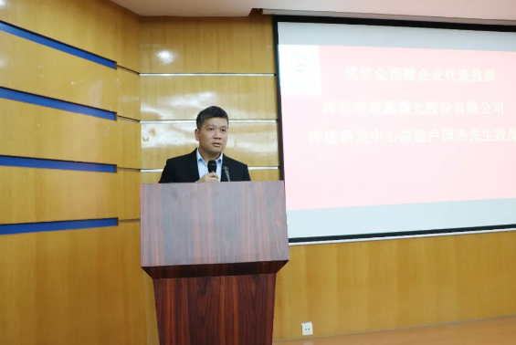 盧國杰總監對三位獲獎學生代表真摯的發言表示非常感動。他感慨道,牛憨笨院士曾是聯贏激光的首席技術專家,牛院士為我國激光技術、光電子學科、深圳大學和聯贏激光的發展作出了不可磨滅的重大貢獻。盧國杰總監表示,獎學金最重要的是一種希望,設立“聯贏-牛憨笨獎學金”是期望同學們在心里種上努力學習、拼搏向上的種子,在未來能為學術研究和技術開發,為激光和光電事業的發展作出自己的貢獻。同時也期待更多的同學能夠在將來從事激光與光電子行業,學以致用。也更歡迎加入我們聯贏激光,投身技術研發創新工作。
