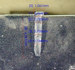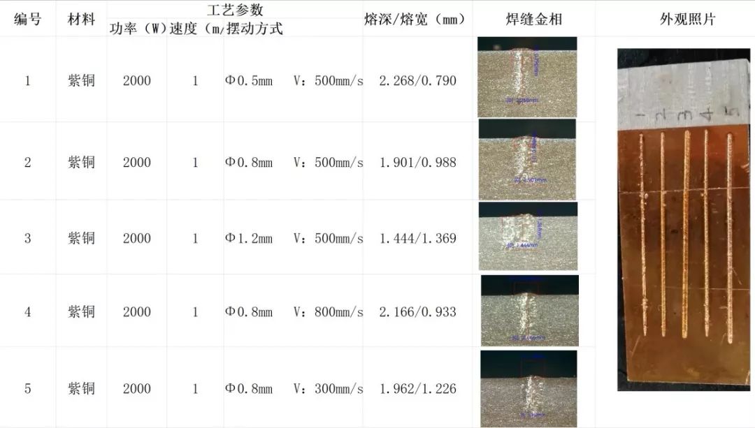 大科激光生產(chǎn)的2kW單模激光器M2因子小于1.2,可用于連續(xù)焊接紫銅,焊縫深度可達2.3mm且無明顯缺陷,表3給出了大科2kW單模激光器焊接紫銅的結(jié)果,實驗表明大科單模激光器在焊接紫銅等高反材料時表現(xiàn)出了良好的適應(yīng)性,為紫銅激光焊接應(yīng)用提供了有效的解決方案。