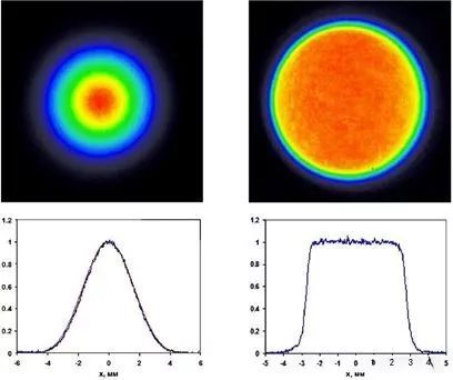 一般來說,激光器輸出光束根據(jù)物理特性可分為單模(single mode)和多模(multi-mode)兩種。按照光束質(zhì)量M2因子的不同,我們可以將M2因子小于1.3的單模激光稱為純單模(pure single mode),其LP01模的能量占比接近100%。M2因子在1.3~2.0之間的單模激光稱為準單模(quasi single mode),其LP01模的能量占比超過90%并出現(xiàn)少量的LP11模和LP02模。多模激光M2因子大于2.0,這種模式下輸出纖芯較大(一般在50μm及以上),模式數(shù)目較多。從能量空間分布特征上來看,單模激光呈現(xiàn)典型的高斯分布,如圖1左所示,而多模激光則是由多個激光模式疊加起來,典型的分布形態(tài)是平頂,如圖1右所示。