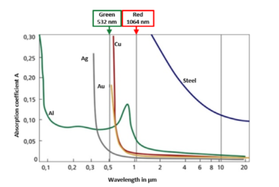 不同材料對不同波長激光的吸收率如圖3所示,從圖中可以看出,用光纖激光(典型波長1080nm)加工高反材料(如Cu、Al、Ag等)時,吸收率極低,常溫下紫銅對1080nm激光的吸收率只有不到5%, 如此低的吸收率使得一般的光纖激光器很難用于加工特別是焊接紫銅、鋁合金等高反材料,這主要體現(xiàn)在兩方面:一方面要求非常高的功率(6mm紫銅焊接,多模激光器的功率需要高達15000W),另一方面高的反射率會引起頻繁的報警甚至會對激光器產(chǎn)生不可逆的破壞。所以目前市場上使用光纖激光器焊接高反材料(特別是紫銅)的成功應(yīng)用案例還不多,雖然通快針對這一痛點推出了綠光激光來解決這個問題,但是目前綠光激光在工業(yè)上應(yīng)用存在功率不足和成本高的兩大難題。
