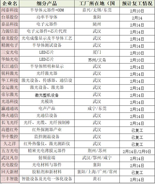 華燦光電:母公司注冊地在湖北武漢,目前在武漢己無生產,僅保留少部分管理和銷售人員。華燦稱,目前各子公司材料庫存能滿足當前生產需要。由于部分供應商復工延期及物流不暢,部分生產材料供應有可能會出現短期遲滯,公司已通過與關鍵供應商溝通協商、積極協調物流渠道等方式,推進材料按需進場。本次疫情對公司的生產經營沒有造成實質的影響。各子公司將于2月10日復工。