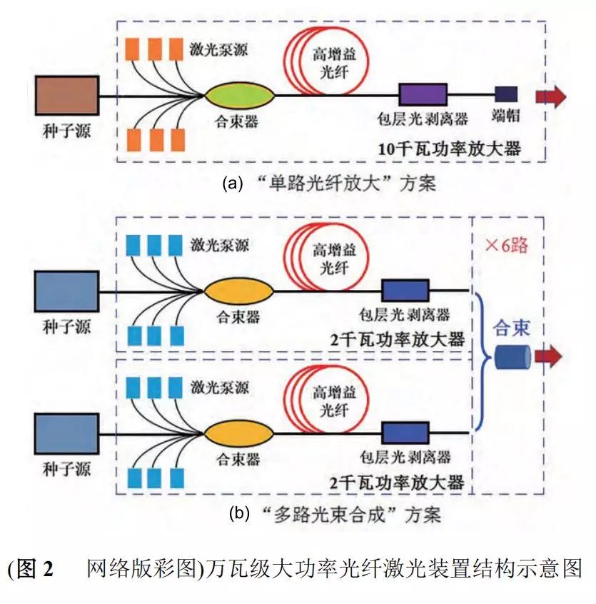 在近十年以來(lái), 大功率光纖激光技術(shù)得到了飛快發(fā)展, 究其原因除了光纖激光器本身的獨(dú)特優(yōu)勢(shì)之外,受到市場(chǎng)行為推廣的光纖激光材料與器件(即高增益雙包層光纖、光纖光柵、合束器、包層光剝離器、大功率泵浦源等)對(duì)激光器的發(fā)展起到了至關(guān)重要的作用。圖2所示為萬(wàn)瓦級(jí)大功率光纖激光裝置結(jié)構(gòu)示意圖, 無(wú)論是“單路光纖放大”還是“多路光束合成”方案,光纖激光系統(tǒng)都主要由:激光種子源、激光泵源、光纖材料與元件(合束器、包層光剝離器等)等幾個(gè)關(guān)鍵部分組成,下面分別予以介紹。