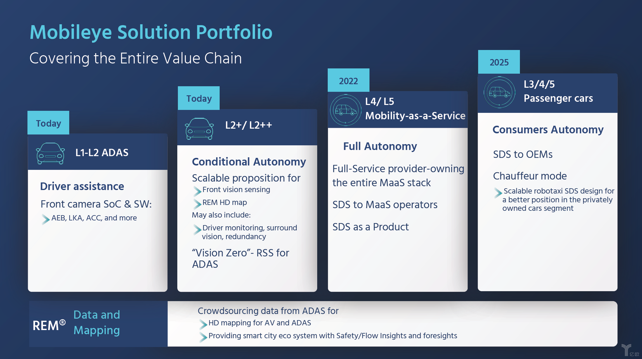 除了特斯拉之外,被英特爾收購的以色列公司Mobileye也一直堅定的在走靠機器視覺實現(xiàn)自動駕駛的路線。
