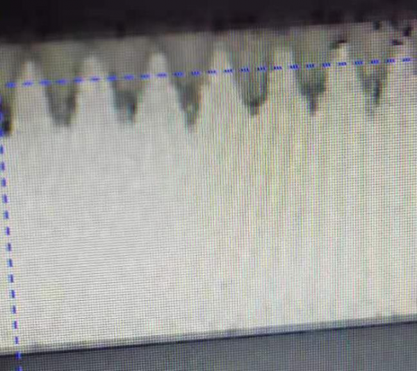 如圖1、2所示,未使用任何吸光劑,激光劃線時會出現斷光,切割不斷的情況發生。劃線深度也不統一,劃線深度不可控。