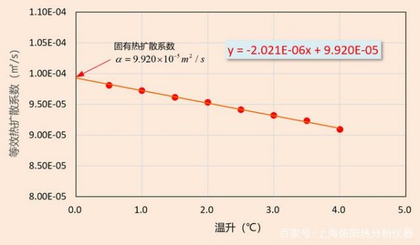 為了解決上述試驗(yàn)參數(shù)對(duì)測(cè)量結(jié)果帶來(lái)的影響,日本國(guó)家計(jì)量研究所(NMIJ)的Akoshima等人開(kāi)發(fā)了一種外推法熱擴(kuò)散系數(shù)測(cè)試規(guī)范[1]。外推法的基本原理是在恒定溫度Tbase下,假設(shè)樣品厚度、脈沖光吸收率和樣品體積熱容不隨溫度發(fā)生改變,通過(guò)改變脈沖加熱能量(即改變背面溫升ΔT大小)測(cè)試得到一系列相應(yīng)的等效熱擴(kuò)散系數(shù)。如圖 2-2所示,以背面溫升ΔT為橫坐標(biāo)、等效熱擴(kuò)散系數(shù)測(cè)量值為縱坐標(biāo),建立起等效熱擴(kuò)散系數(shù)與背面溫升的線性函數(shù)關(guān)系,最終用此線性函數(shù)外推得到脈沖加熱能量為零時(shí)的等效熱擴(kuò)散系數(shù),由此認(rèn)為此外推得到的熱擴(kuò)散系數(shù)即為樣品材料在溫度Tbase時(shí)的固有熱擴(kuò)散系數(shù)。