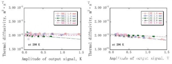 在各向同性石墨的情況下(其顯示出室溫附近熱擴(kuò)散系數(shù)的強(qiáng)溫度依賴(lài)性),從具有最大溫升的溫升曲線計(jì)算的表觀熱擴(kuò)散系數(shù)比使用外推法估計(jì)的固有值小3%。由于NMIJ和LNE估計(jì)熱擴(kuò)散系數(shù)測(cè)量的典型不確定度約為2~3%,因此這種誤差就非常明顯。結(jié)果表明,外推法有助于獲得固有熱擴(kuò)散系數(shù),同時(shí)避免測(cè)量過(guò)程中由于樣品溫度變化造成的偏差。通過(guò)對(duì)兩種半透明性材料(3YSZ和Si3N4)的測(cè)試對(duì)比,也證明了外推法有助于檢測(cè)熱擴(kuò)散系數(shù)的估計(jì)值是否正確,并具有識(shí)別材料任何潛在半透明效應(yīng)的功能。