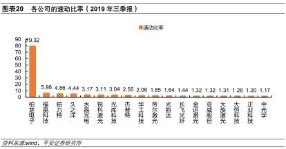 此外,債務(wù)為上市公司現(xiàn)金流帶來的壓力也普遍不大。激光裝備制造業(yè)并不是一個高負(fù)債的行業(yè),從2019年Q3的數(shù)據(jù)看,相關(guān)上市公司中僅一家資產(chǎn)負(fù)債率高于50%。從2019年Q3的速動比率來看,行業(yè)內(nèi)所有上市公司均超過1倍,約半數(shù)的上市公司超過2倍,風(fēng)險整體可控。