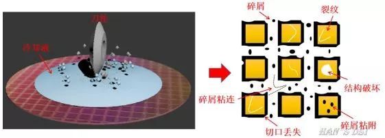 傳統的晶圓切割通常使用刀輪,刀輪切割主要通過其穩定、高速的旋轉對晶圓進行磨削,切割過程中需要使用冷卻液降低溫度和帶走碎屑。