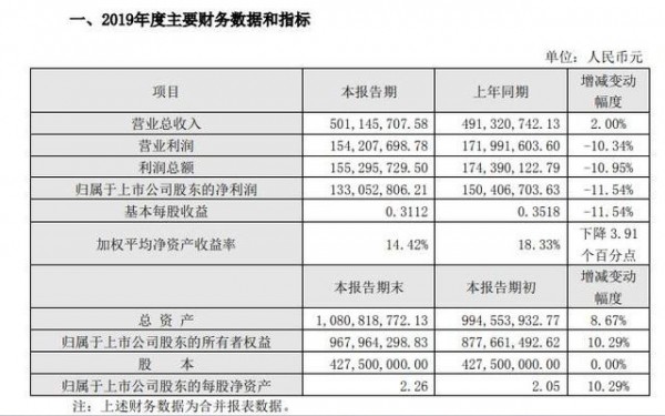 據了解,報告期內,國內外經濟形勢復雜,晶體業務市場需求放緩,晶體元器件業務收入小幅下滑,公司加強精密光學元件和激光器件的產品和市場開發,取得積極的成效,彌補了晶體元器件業務收入的下降。2019年度,公司實現營業收入50,114.57萬元,比上年增長2.00%,實現歸屬于上市公司股東的凈利潤13,305.28萬元,比上年下降11.54%;2019年末資產負債率為7.61%,比上年末下降2.30個百分點,資產結構未發生重大變化。