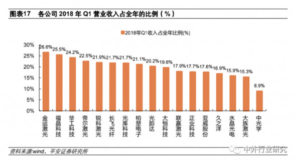 激光產業鏈傳統的旺季多出現在4-5 月份和11-12 月份,1 季度收入占比普遍不高。
